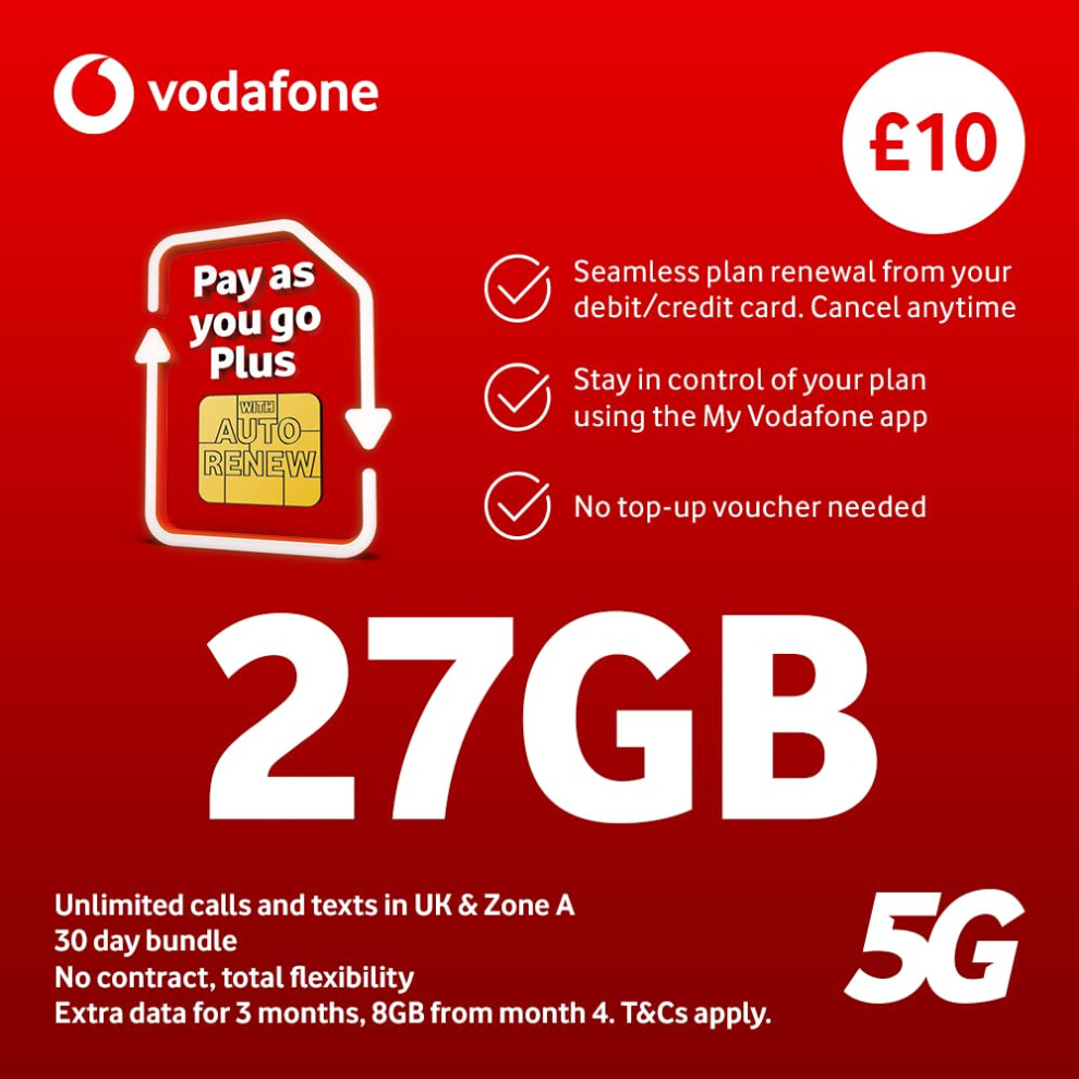 Vodafone Pay As You Go Plus SIM, 27GB Data, Unlimited UK Calls & Texts, 30 Days, 5G