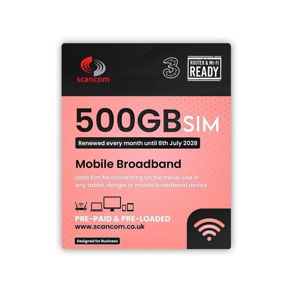 Three 500GB Data SIM Card – for Portable WiFi, Routers & Phones – Preloaded Monthly Until July 2028 – Dual Network (Three & Vodafone) Stronger Coverage