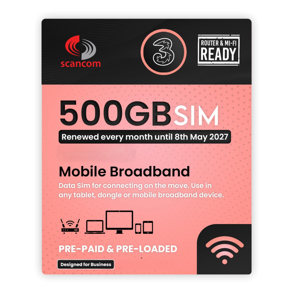 Three 500GB Data SIM Card – for Portable WiFi, Routers & Phones – Preloaded Monthly Until November 2027 – Dual Network (Three & Vodafone) Stronger Coverage