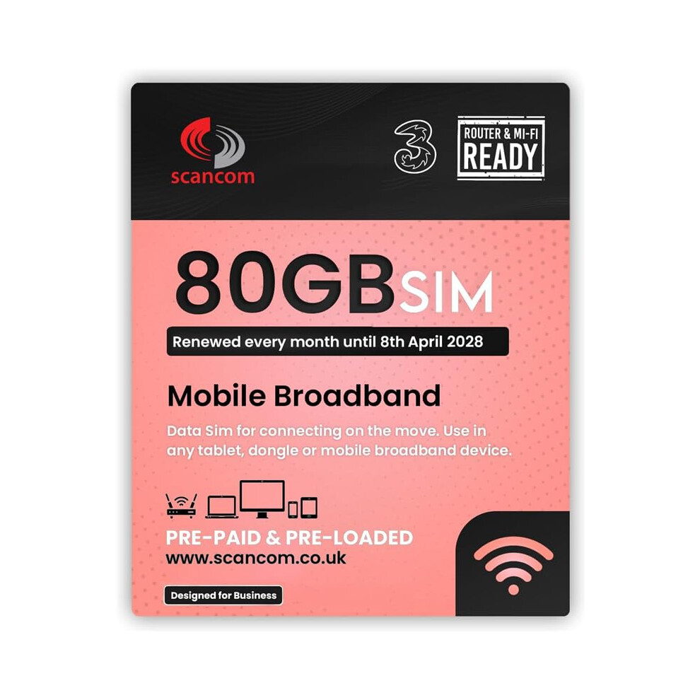 Three 80GB Data SIM Card – for Portable WiFi, Routers & Phones – Preloaded Monthly Until April 2028 – Dual Network (Three & Vodafone) Stronger Coverage