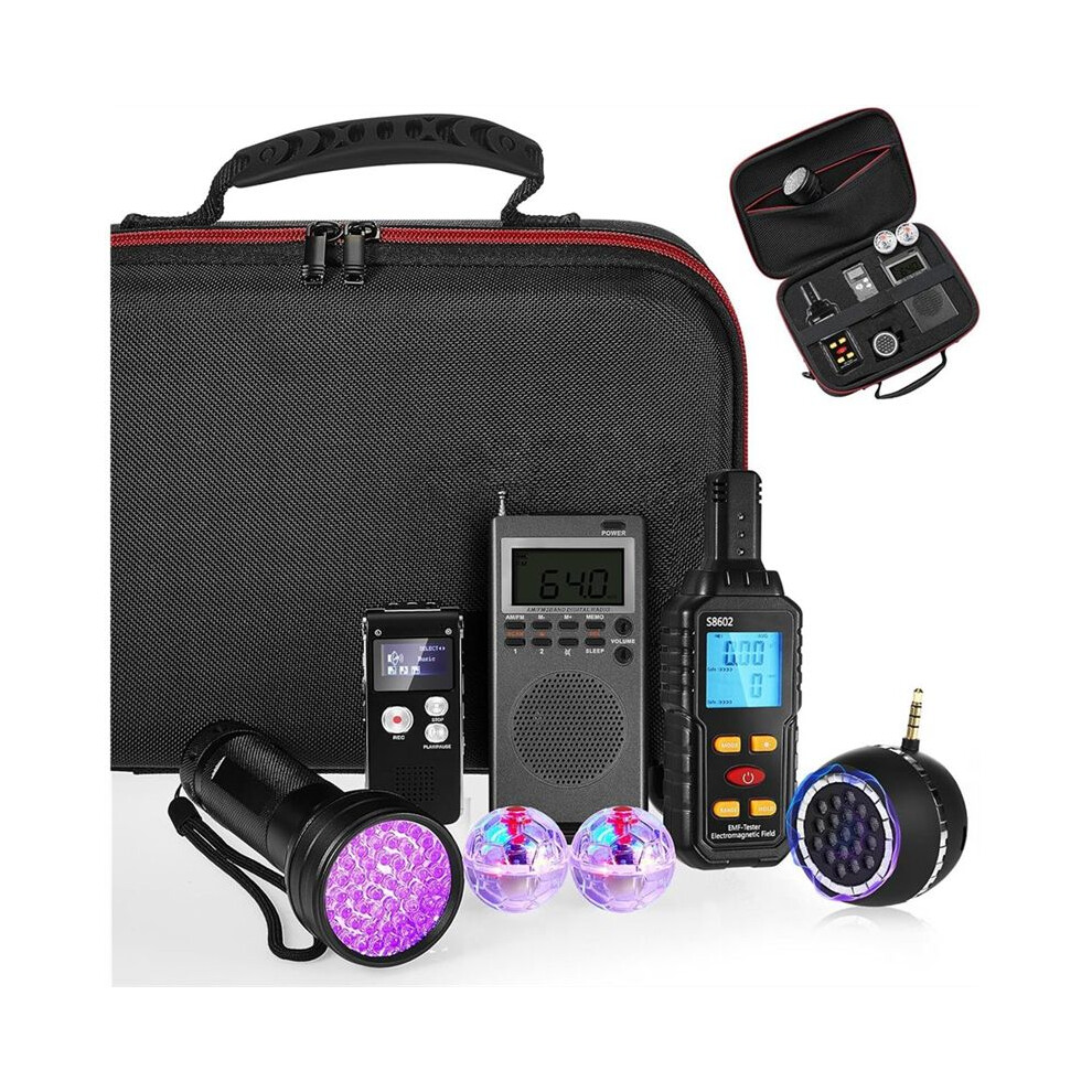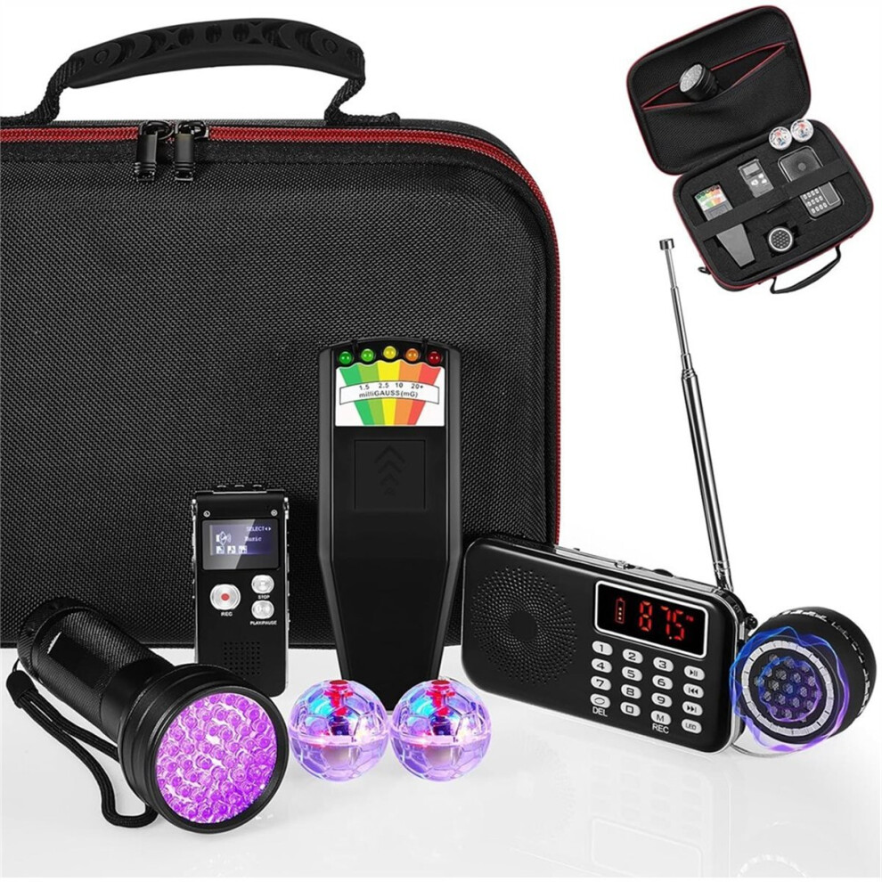 8Pcs Equipment Kit,1 Emf Meter 1Case 1 Voice Recorders 1 Flashlight 1 Speaker 2 Motion Light Up Cat Balls and 1 Fm Radio