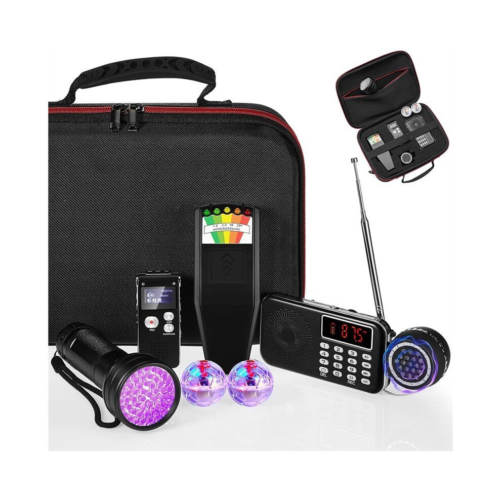 8Pcs Equipment Kit,1 Emf Meter 1Case 1 Voice Recorders 1 Flashlight 1 Speaker 2 Motion Light Cat Balls and 1 Fm Radio
