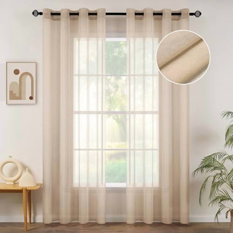 Beige Khaki Sheer Grommet Top Voile Curtains (54x84"), Linen-Textured, for Bedroom & Living Room