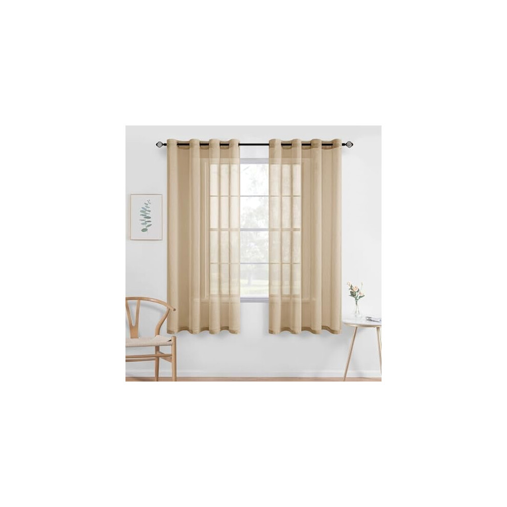 Beige Khaki Sheer Grommet Top Voile Curtains (54x63 in), Linen-Textured, for Bedroom & Living Room