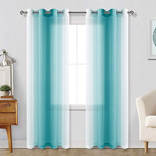 Hiasan Ombre Sheer Curtains for Living Room - Faux Linen Voile Grommet Window Curtains for Bedroom, Set of 2 Panels, 52 x 108 Inches Long, Turquoise Gradient