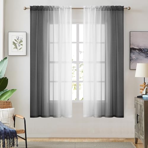 Black Ombre Faux Linen Sheer Curtains for Bedroom Living Room Rod Pocket, 2 Tone Reversible Gradient Voile Semi Window Curtains,Privacy and Light Filtering, Set of 2 Panels, 54 x 63 Inch Length