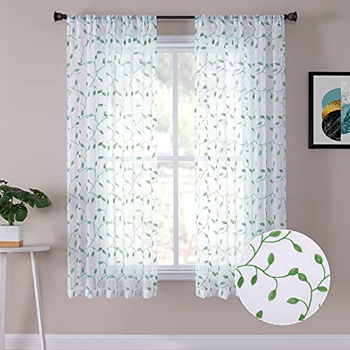 Tollpiz Leaves Short Sheer Curtains Green Leaf Embroidery Bedroom Curtain Rod Pocket Voile Faux Linen Embroidered Leaves Curtains for Living Room, 54 x 45 inches Long, Set of 2 Panels