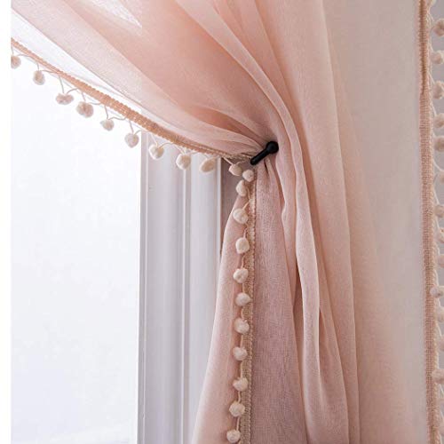 MISS SELECTEX Linen Look Pom Pom Tasseled Sheer Curtains - Rod Pocket Voile Semi-Sheer Curtains for Living and Bedroom, Set of 2 Curtain Panels (52 x 84 inch, Blush)