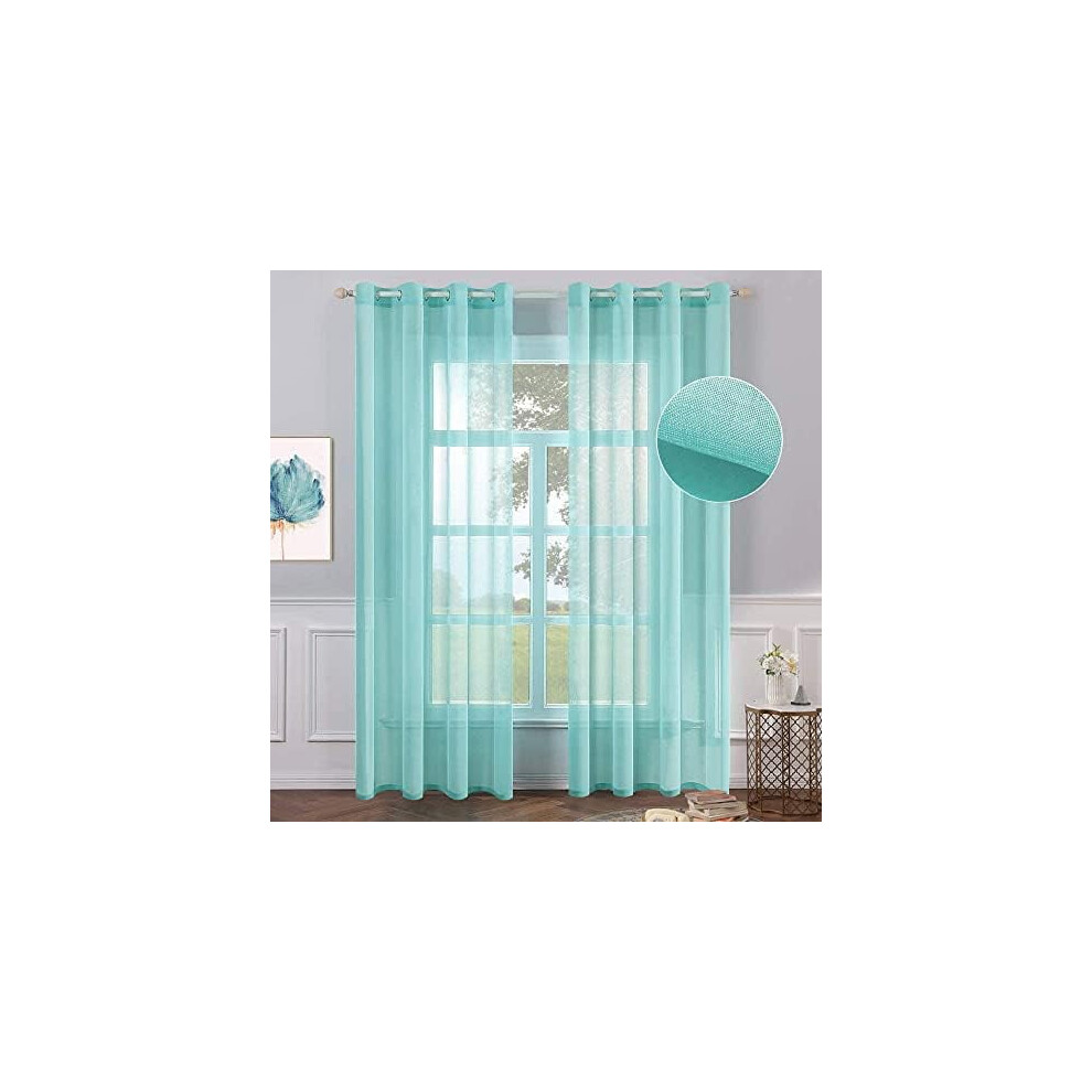 2 Turquoise Semi-Sheer Grommet Voile Curtains, Aqua Blue Linen Texture, 54x96", for Bedroom & Living Room
