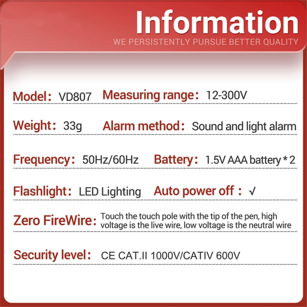 VD807 Digital Voltage Detector Tester Pen AC12-300V Testers Circuit NCV Sensor Wire Electrician Tool(Red)