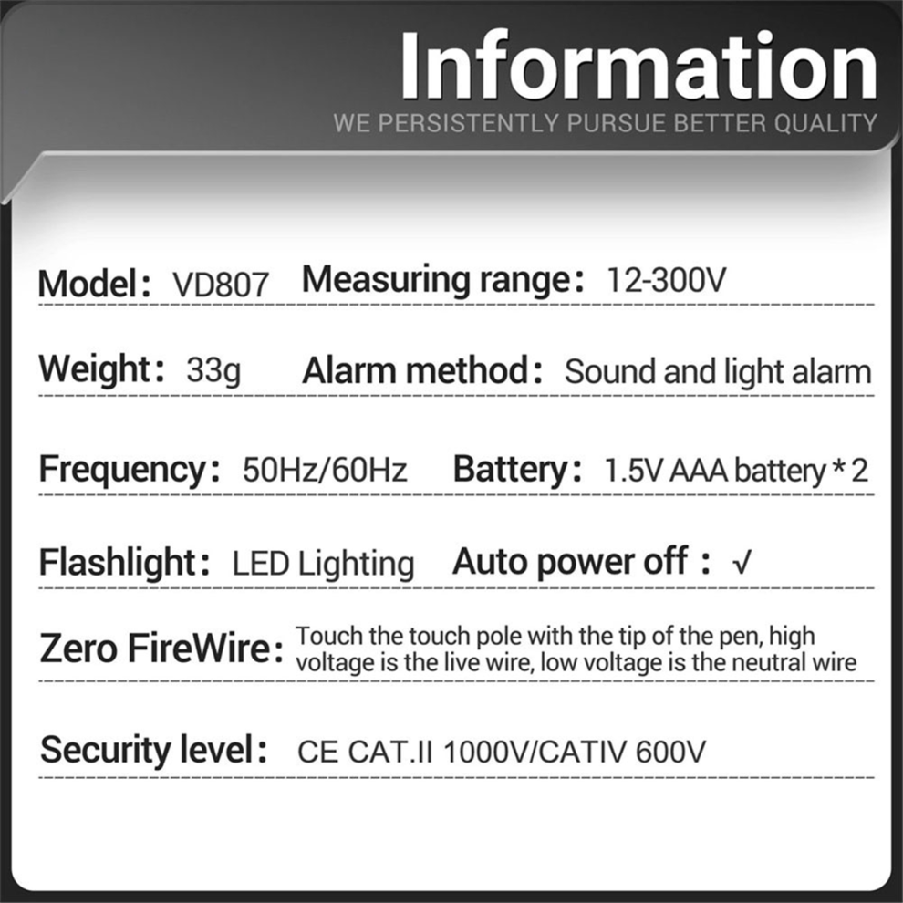 VD807 Digital Voltage Detector Tester Pen AC12-300V Testers Circuit NCV Sensor Wire Electrician Tool(Black)