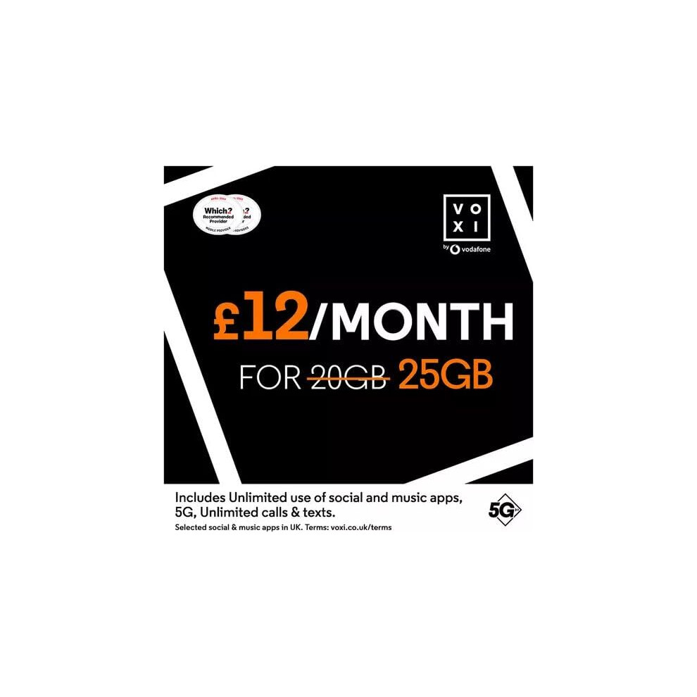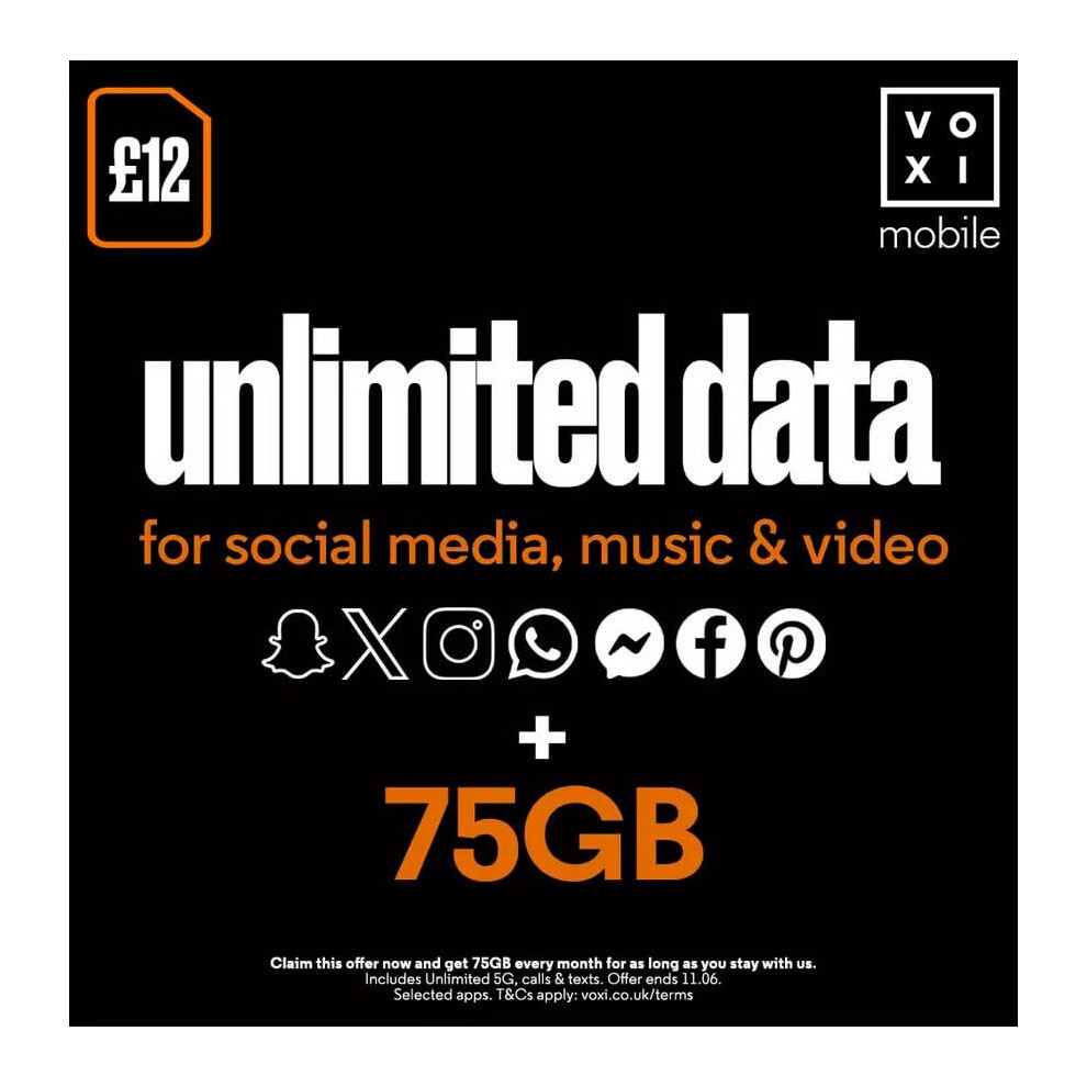 VOXI Sim card deal - Unlimited text and calls 75GB Data for 12 per month