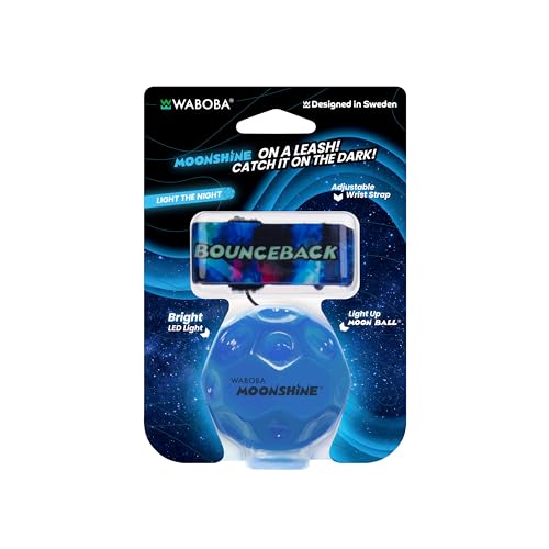 Waboba LED Bounceback Moon Ball with Wrist Strap – High-Bounce Tether Ball with Motion-Activated Lights – Improves Hand-Eye Coordination – Adjustable for Kids & Adults – Blue