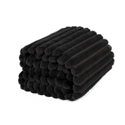 OHS Faux Fur Ribbed Throw Blanket for Sofa, Super Soft Cosy Warm Winter Thick Fleece Blanket for Bed Decorative Fluffy King Size Bed Throws Over Sofas Couch, Black - 200 x 240cm