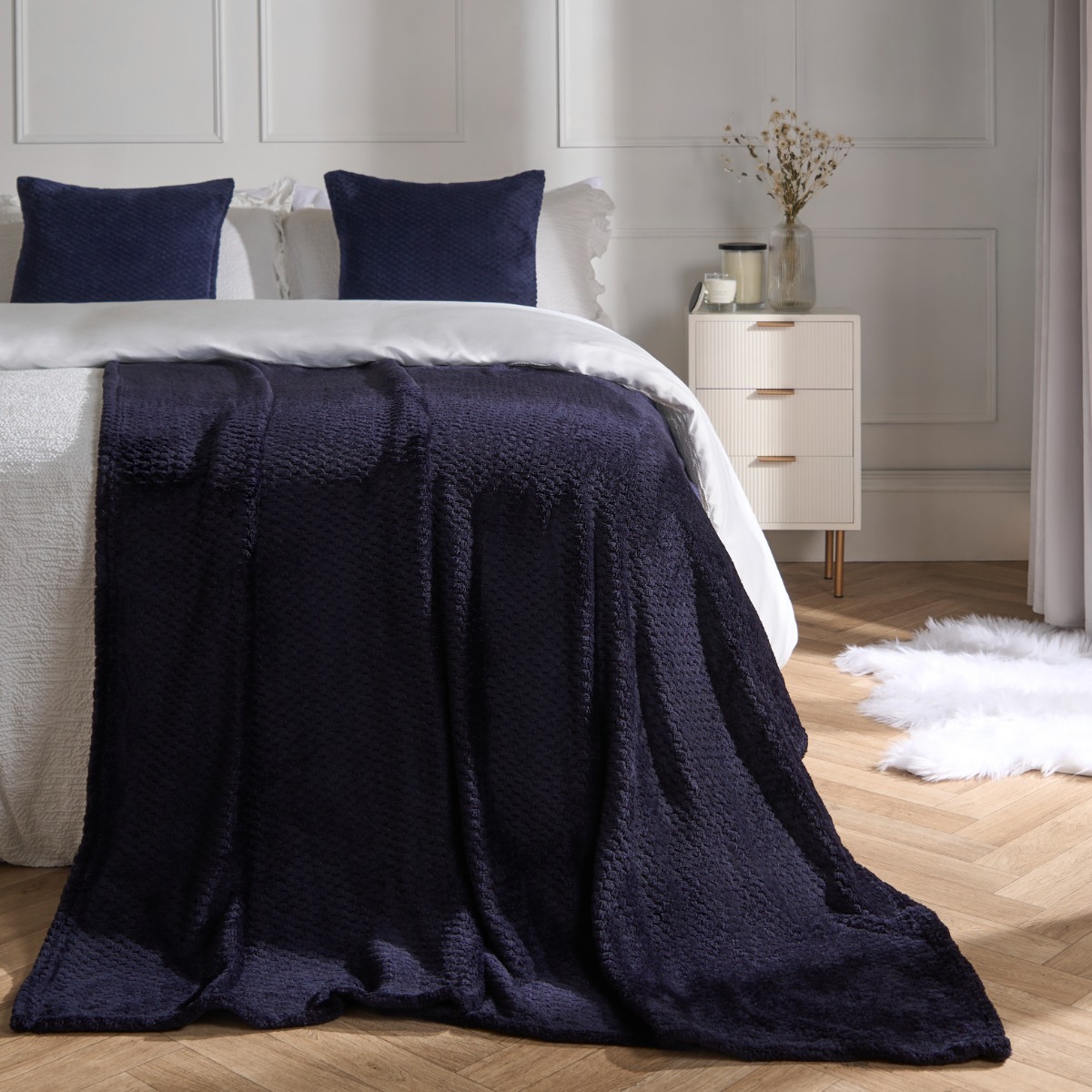 OHS Luxury Large Waffle Honeycomb Mink Warm Throw in Navy | Size: 200cm x 240cm