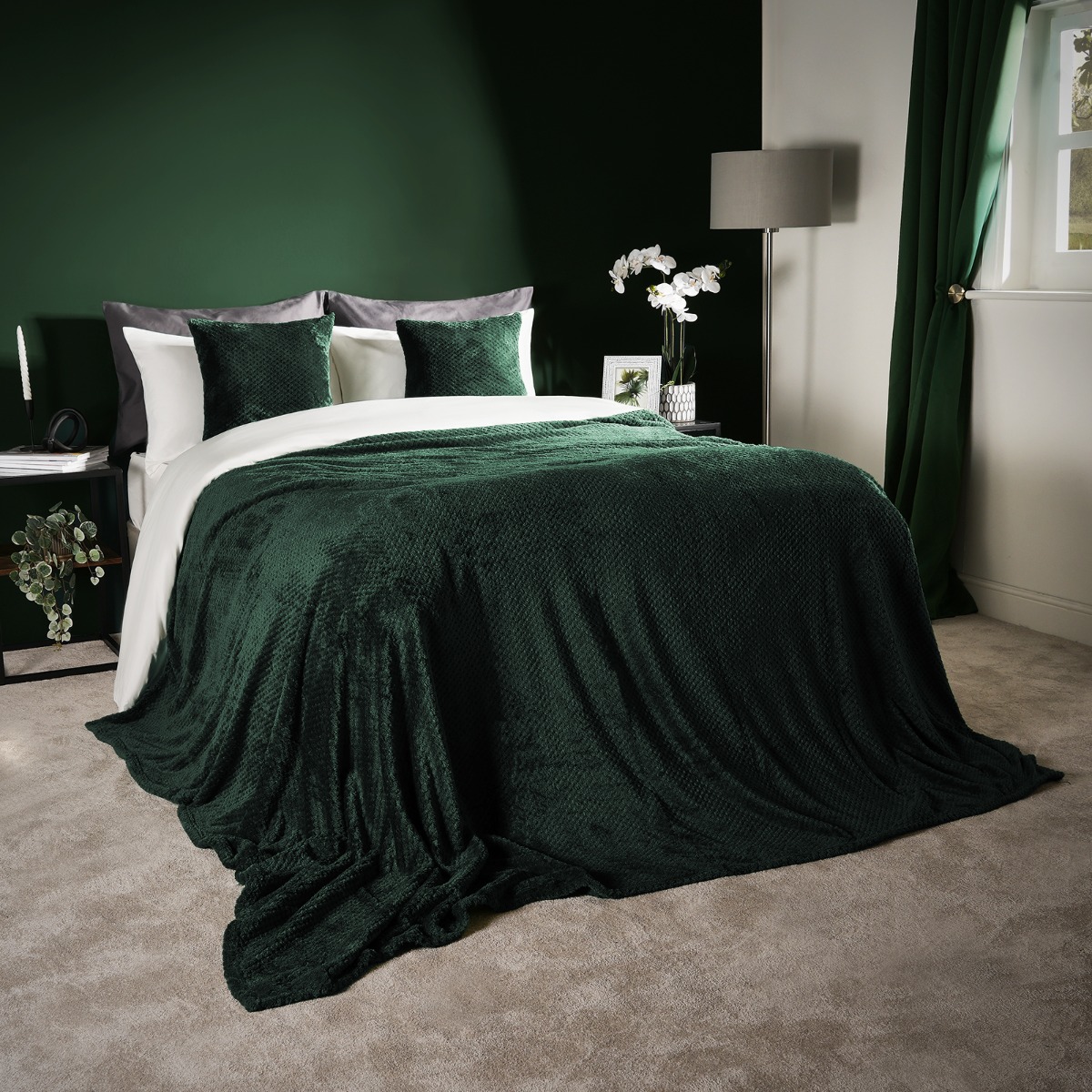 Dreamscene Throws for Sofas Green Blanket, Soft Cosy Warm Honeycomb Waffle Bed Throw King Size Fleece Blanket for Bed Settee Sofa Throws Fluffy Faux Fur Throw, Forest Green - 200 x 240cm