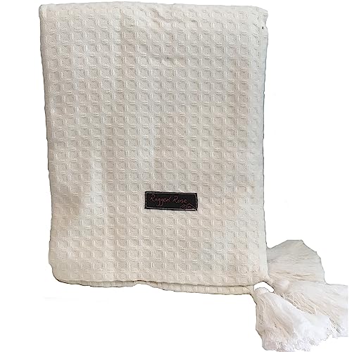 Ragged Rose 140 cm x 180 cm Waffle Throw - Versatile Indoor & Outdoor Throw Waffle Weave Cotton with Corner Tassles - Cotton Throws for Sofa & Bed (Cream)