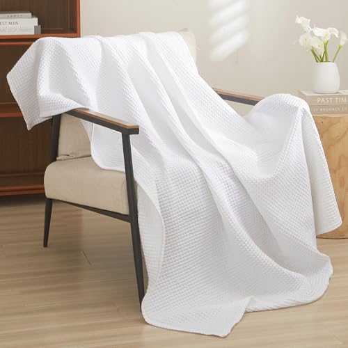 PHF 100% Cotton Waffle Weave Throw Blanket 50" x 60"-Lightweight Washed Soft Breathable Blanket for Adults and Kids-Perfect Blanket Layer for Couch Bed Sofa-Elegant Home Decoration- White