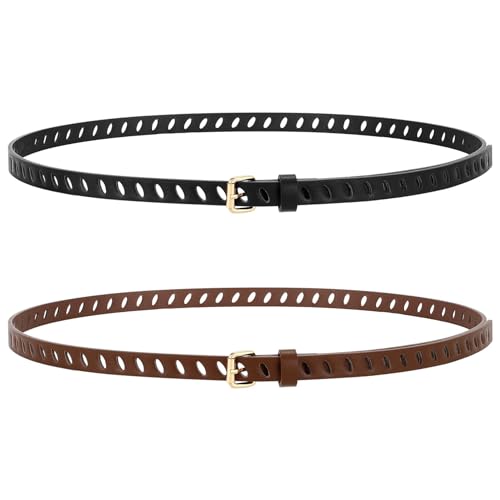 WHIPPY 2 Pack Skinny Leather Belts for Women with Pin Buckle Fashion Ladies Thin Waist Belts for Jeans Dresses Trousers Full-Hole Skinny Belt, Black Coffee 47"