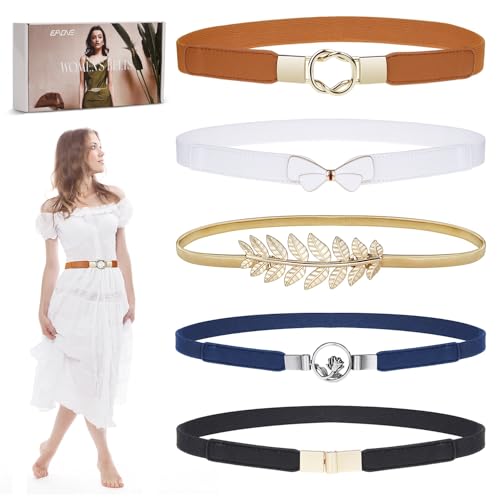 EAONE Skinny Belts for Women 5 Pack, Fashion Dress Belts Stretch Women Waist Belts Plus Size Elastic Waist Band for Dresses, E-gold/Black/Black/Black/Black