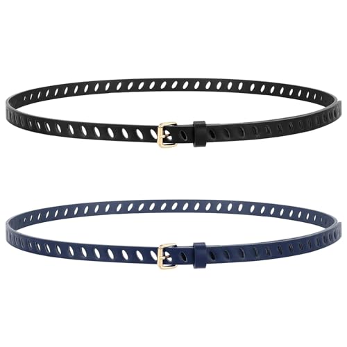 WHIPPY 2 Pack Skinny Leather Belts for Women with Pin Buckle Fashion Ladies Thin Waist Belts for Jeans Dresses Trousers Full-Hole Skinny Belt, Black Blue 39"