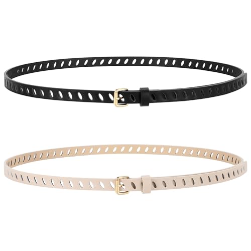WHIPPY 2 Pack Skinny Leather Belts for Women with Pin Buckle Fashion Ladies Thin Waist Belts for Jeans Dresses Trousers Full-Hole Skinny Belt, Black Beige 47"