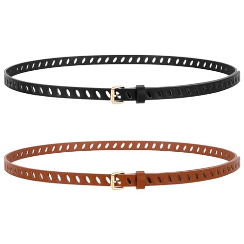 WHIPPY 2 Pack Skinny Leather Belts for Women with Pin Buckle Fashion Ladies Thin Waist Belts for Jeans Dresses Trousers Full-Hole Skinny Belt, Black Brown 43"