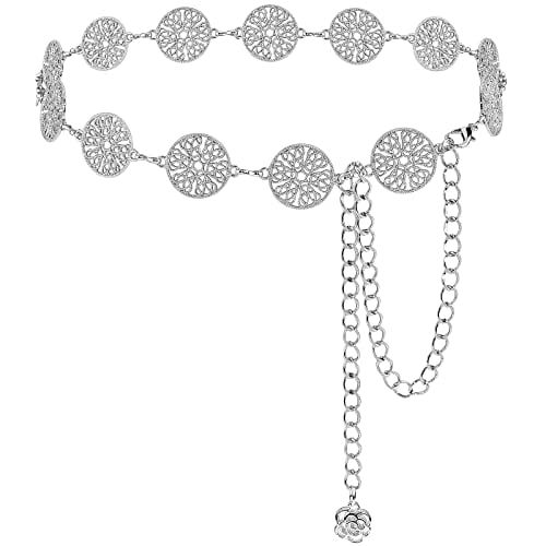 Amabro Women Metal Chain Belt, Western Concho Chain Belt Adjustable Boho Waist Chain Belts for Dresses Jeans Cowgirl(Silver)