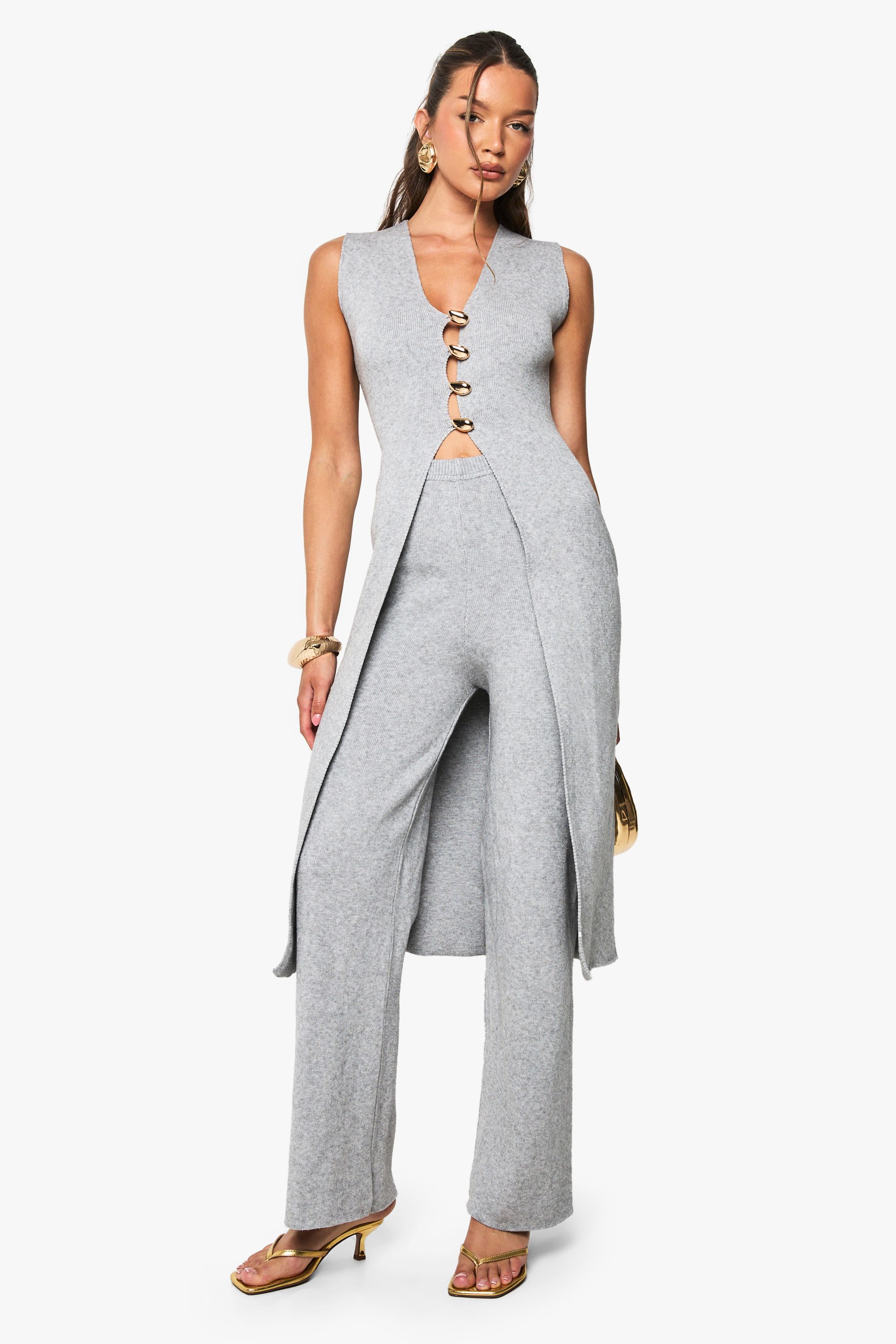Boohoo Womens Gold Button Detail Longline Knitted Waistcoat and Wide Leg Trouser Co-Ord - Grey Viscose - Size Medium