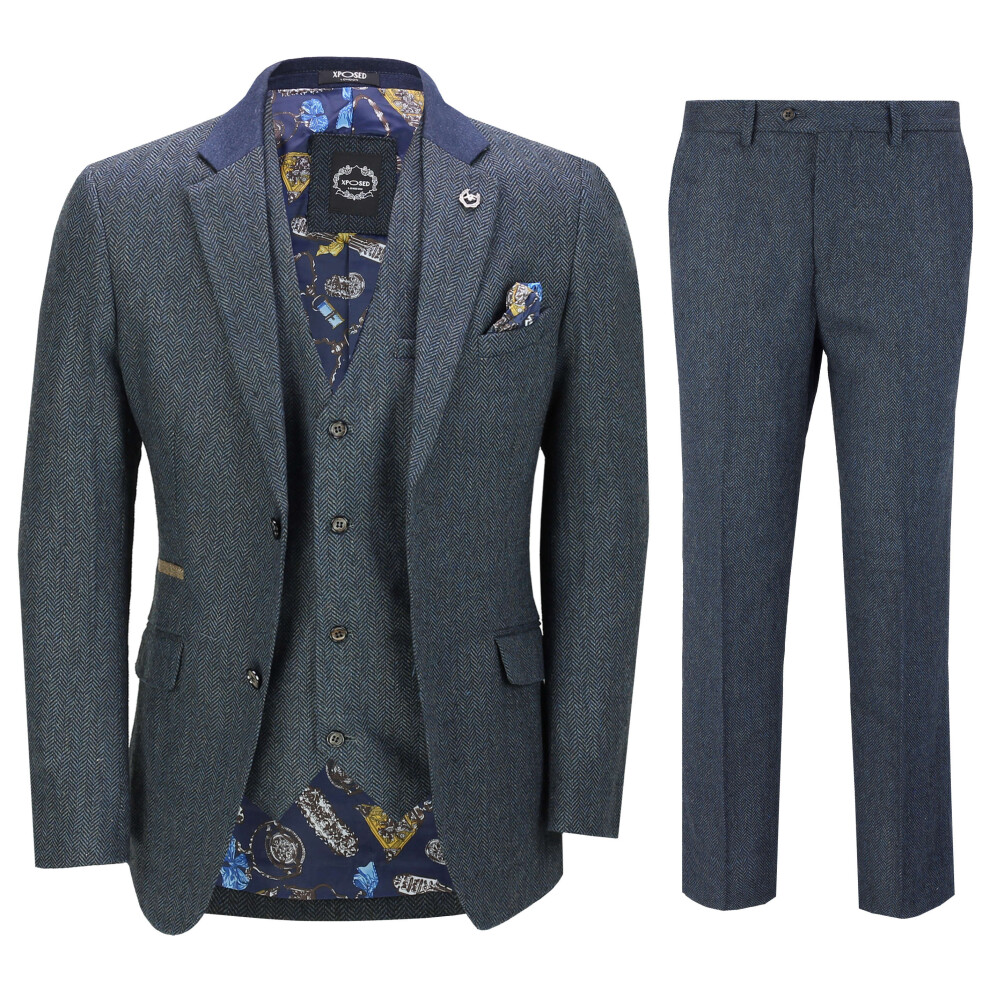 (44, Navy Blue) Mens 3 Piece Herringbone Tweed Suit in Navy Retro Style Blazer Waistcoat Trouser