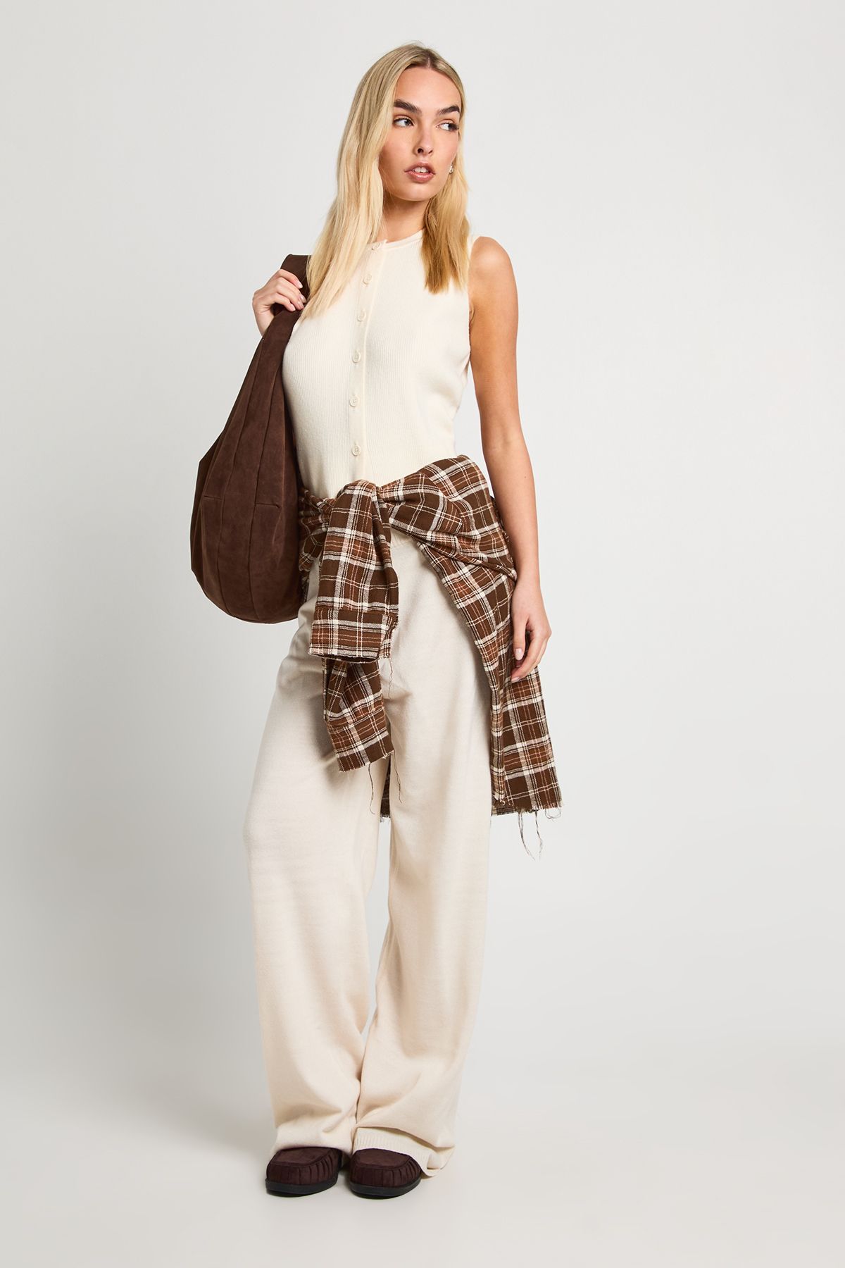 Boohoo Womens Knitted Waistcoat and Wide Leg Trouser - Beige Viscose - Size Large