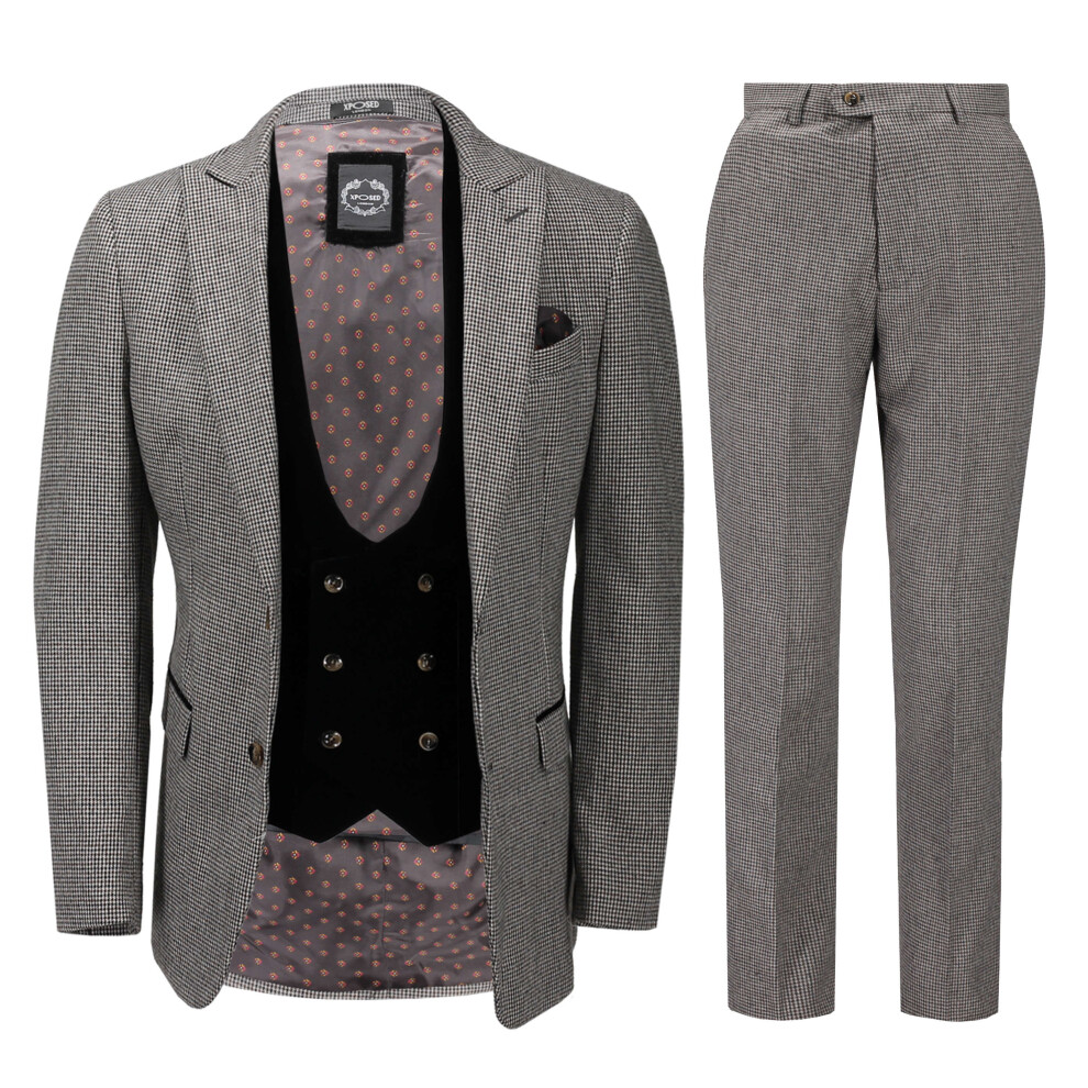 (36, Grey) Mens Houndstooth Check Suit 3 Piece Classic Wool Blend Tailored Fit Jacket Waistcoat Trouser