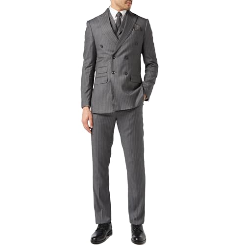 Mens Grey 3 Piece Double Breasted Pinstripe Suit Retro Vintage Blazer Waistcoat Trousers [Chest UK 42 EU 52,Trouser 36",Grey]