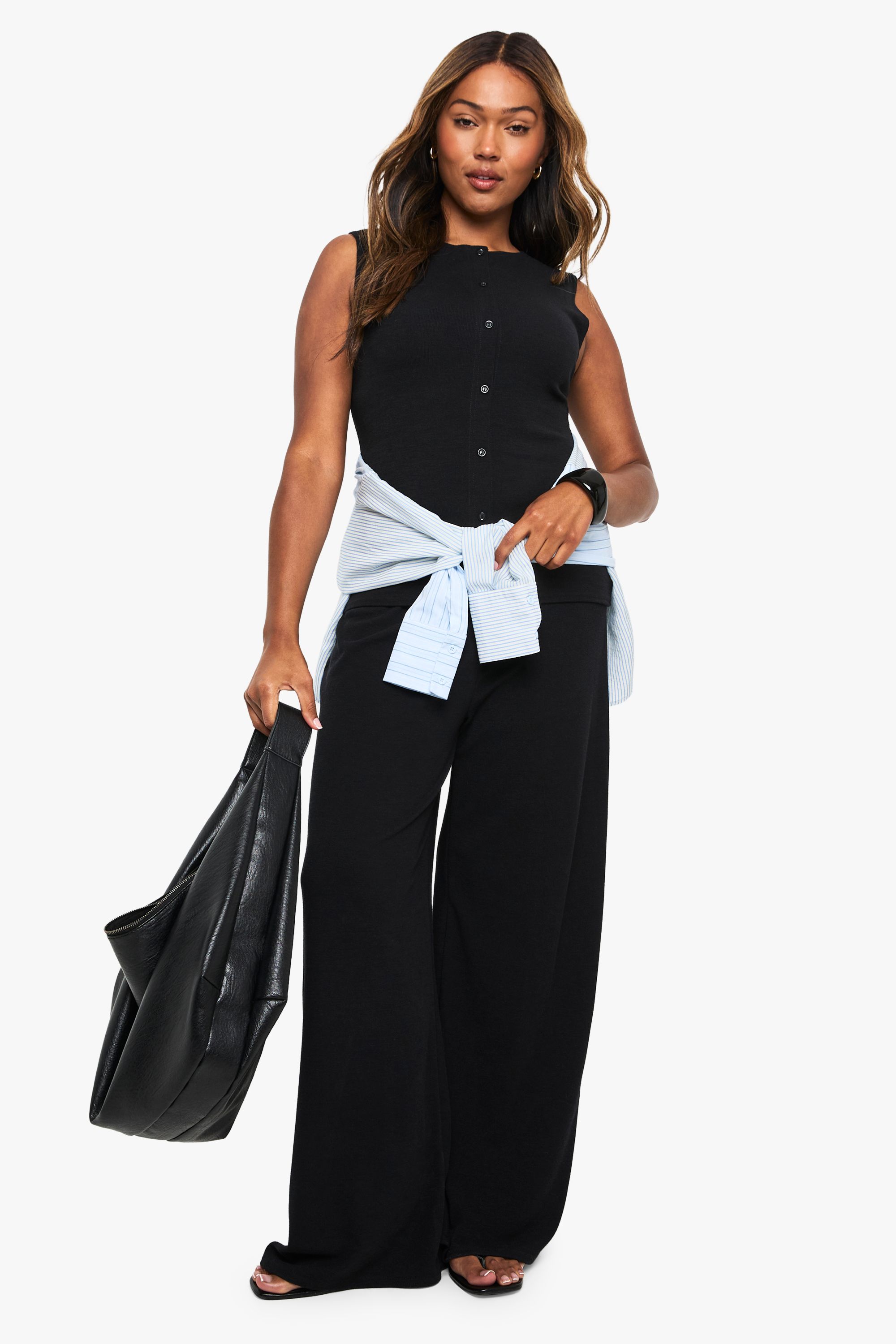 Boohoo Womens Super Soft Rib Knitted Waistcoat and Wide Leg Trouser Co-Ord - Black - Size Large