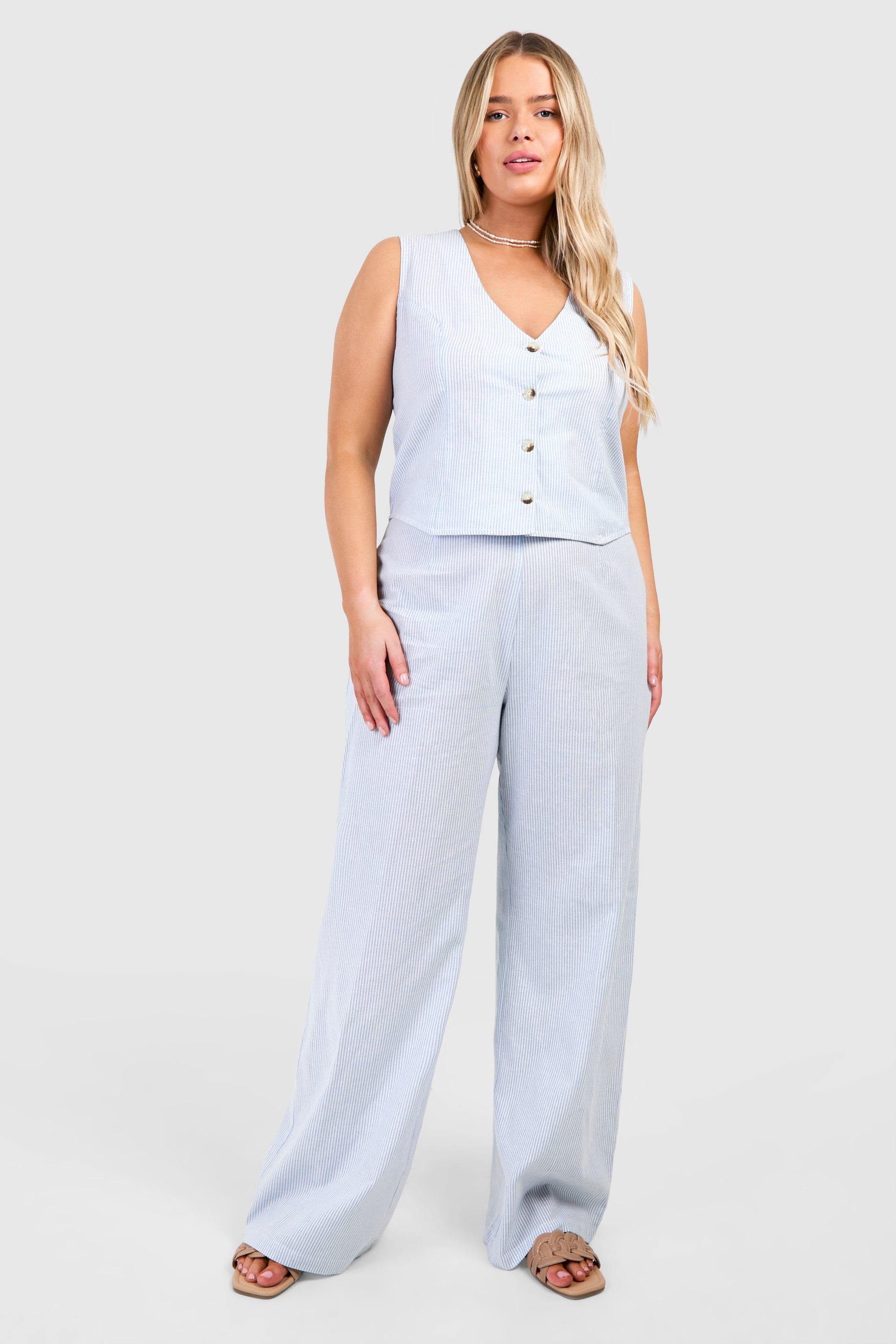 Boohoo Womens Plus Woven Pinstripe Wide Leg Trouser & Waistcoat Co-ord - Blue Cotton - Size 28 UK