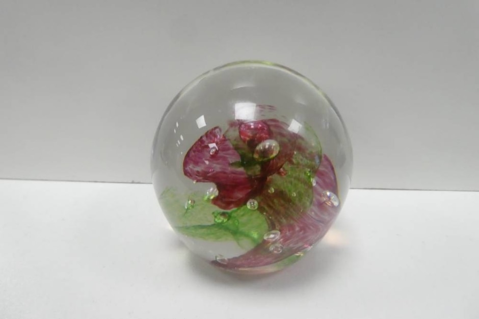 Handblown Belle Walker Glass Paperweight – Green & Red Swirl Flower – Signed