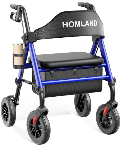 HOMLAND Walkers for Seniors with Seat, Foldable Rollator Walker, Reinforced Aluminum Frame, 8" Big Rubber Wheels for All Terrain, Height Adjustable Lightweight Rolling Walker
