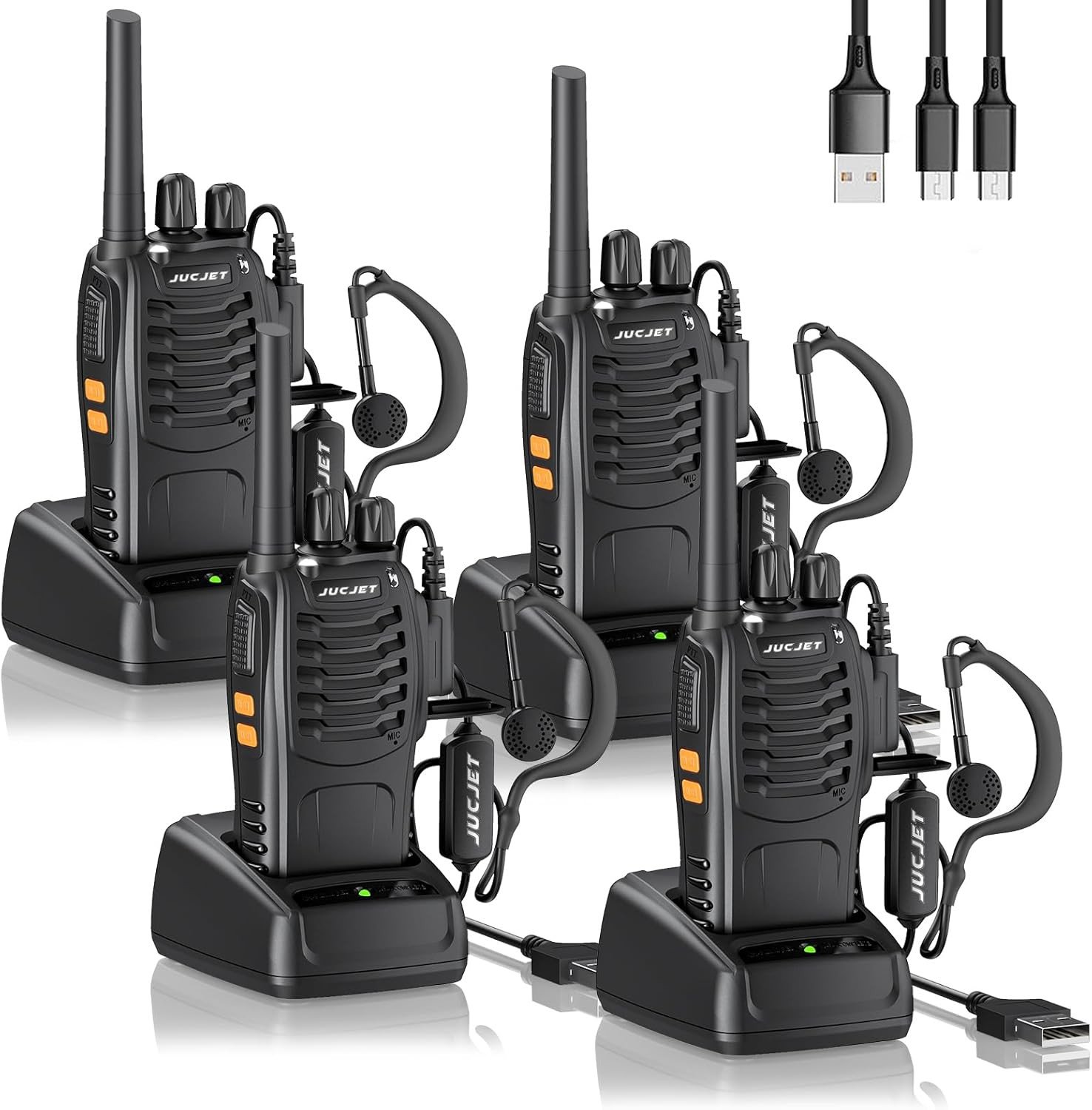 JUCJET Walkie Talkies 2023 Upgraded 88E Walkie Talkie Long Range for Adults with Earpieces, 16 Channel Handheld 2 Way Radio Rechargeable with Flashlight Li-ion Battery and Charger(4 Pack)