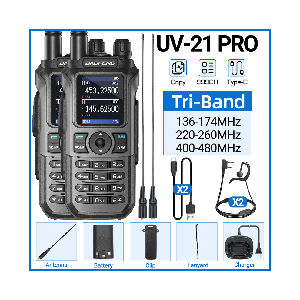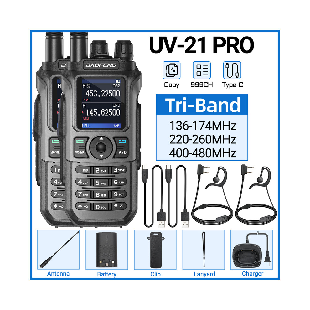 (Grey Standard) 2PCS UV-21 PRO V2 Walkie Talkie Long Range Wireless Copy Frequency Type-C Tri band Powerful Waterproof