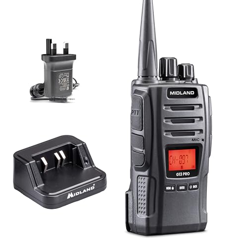 Midland - G13 Walkie Talkie, License Free, Walkie Talkies for Hunting, UK Plug and Belt Clip, Long Lasting Radio, Touch Recognizable Control Layout, Waterproof, Rechargeable Battery Pack