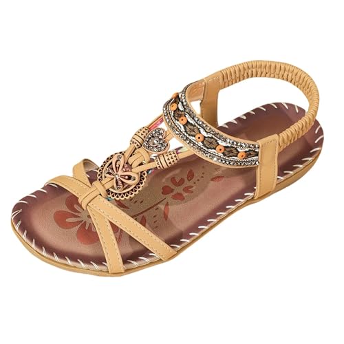 wide fit walking sandals for women Women's Sandal Flat Bohemian Beaded Summer Sandal Casual Anti-slip Elastic Ankle Strap Slides Comfy Open Toe Dressy Boho Wedge Shoes ladies summer sandals Yellow 8
