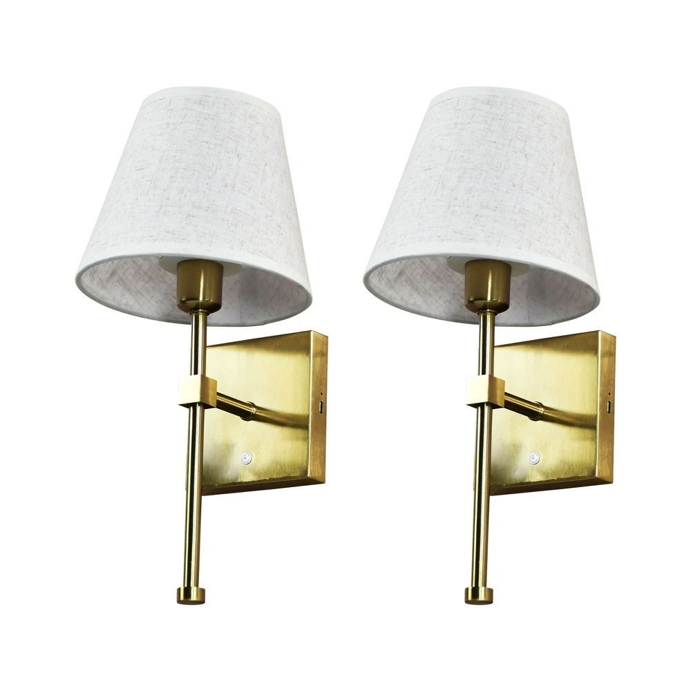 Set of 2 Modern Satin Brass Rechargeable Wall Lights Bedside Lamp Linen Shade