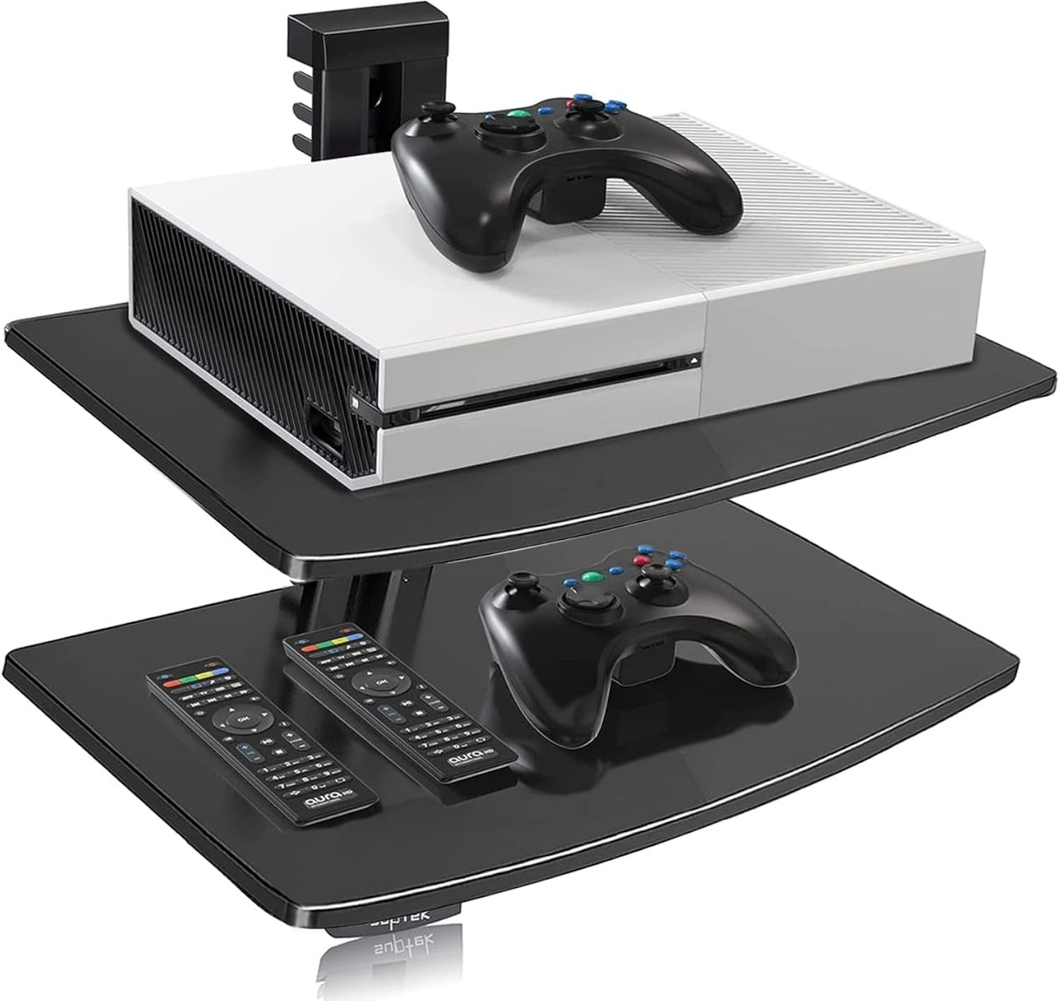Suptek Black Glass Floating Shelf Wall Bracket for TV Accessories, 2 Shelves
