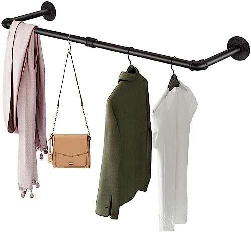 YheenLf Industrial Pipe Clothing Rack, 105 x 26 x 15cm Wall Mounted Clothes Rail with Top Shelf, Space Saving Display Closet Shelves for Bedroom, Livingroom, Black