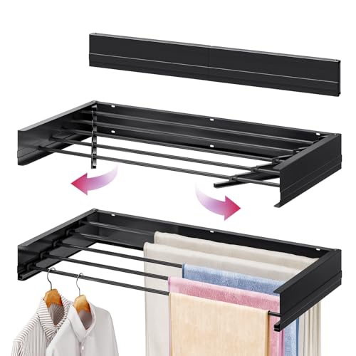 YOUDENOVA Foldable Clothes Airer Wall Mounted Clothes Rail Retractable Towel Holder Bathroom Towel Rack Clothes Drying Rack Indoor Folding Strong Metal (Black, L)