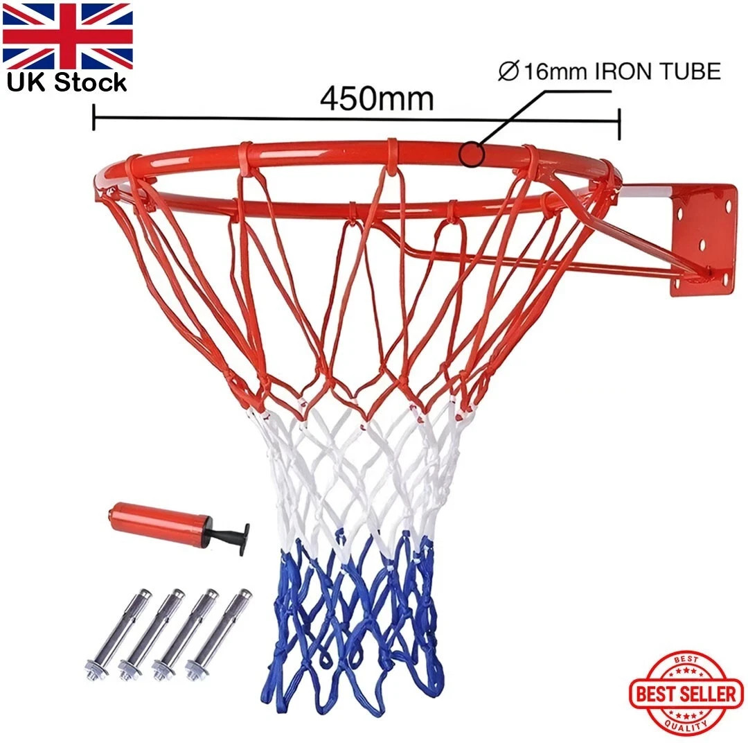 Basketball Hoop 18"/45cm – Wall Mounted Outdoor Hanging Ring with Net – Heavy Duty Steel Basket for Training & Recreation (Multi)