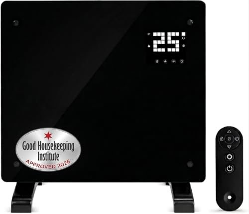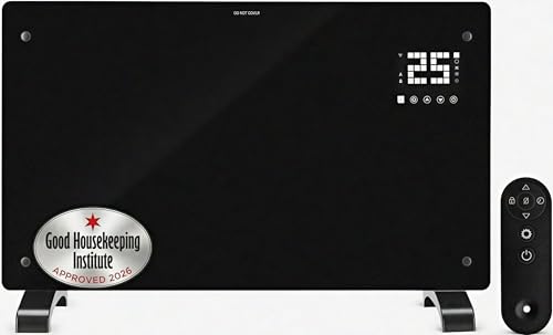 Futura 1000W Black Glass Electric Radiator Heaters for Home, Bathroom Safe Electric Heater Setback Timer Lot 20 & Advanced Thermostat Control Wall Mounted or Floor Standing Low Energy Panel Heater