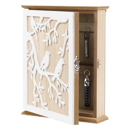 Miosugo Wooden Key Cabinet, Decorative Key Cabinet with 6 Key Hooks, Wall Metal Lock Key Holder, for Entrance, Room, Hallway (White Birds)