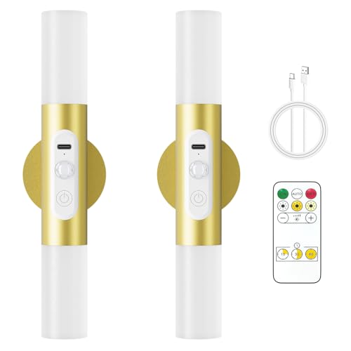 Hensam Motion Sensor Wall Sconces with Remote Control, LED Rechargeable Battery Operated Wall Lights Set of Two for Stair, Indoor Wireless Wall Lamps for Bedroom, Hallway, Living Room, Gold 2 Pack
