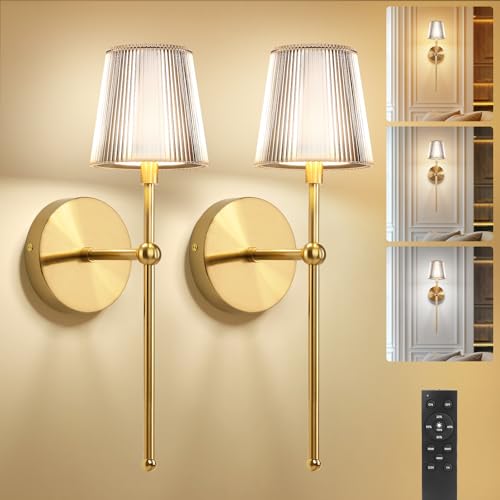 Kimjo Acrylic Gold Battery Operated Wall Lights Set of 2, 5200mAh Rechargeable Wall Light Indoor, Modern Wall Sconces with Remote, Wireless Wall Mounted Lamps for Bedroom Living Room Dining Room